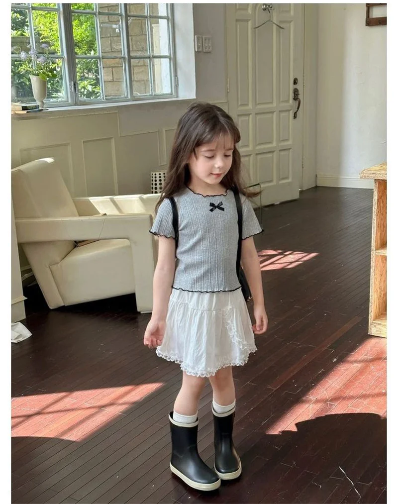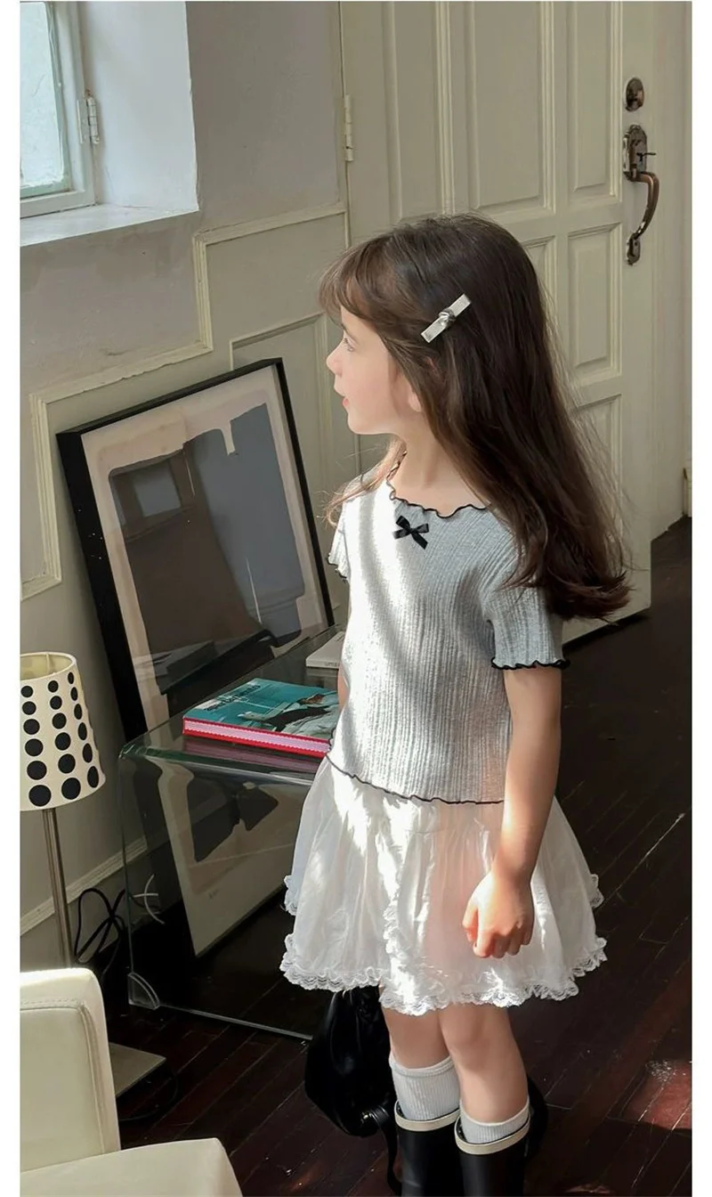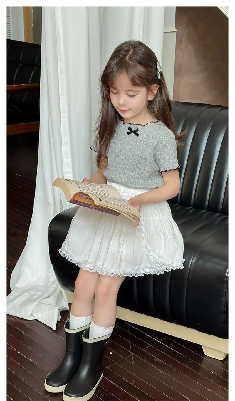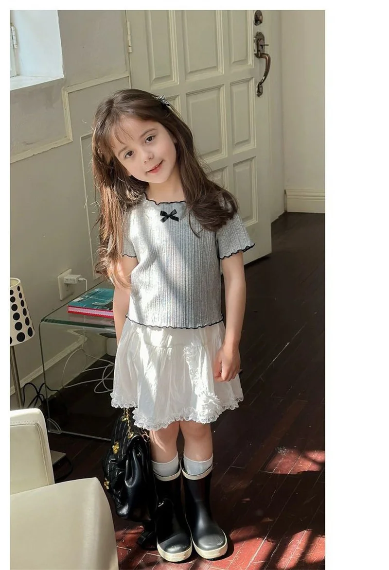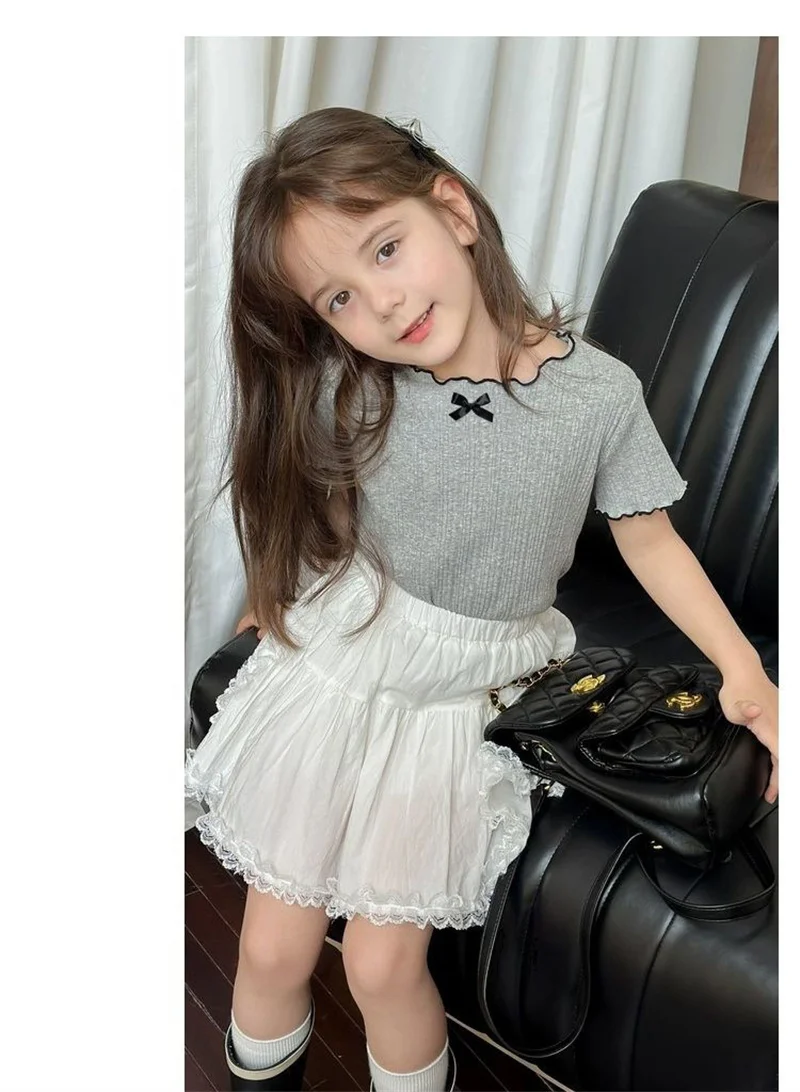Girl Baby Thin Knit Ruffle Lace Short Sleeve T-shirts 2025 Summer New Girls Kids Bow Tops Sweet Cute Student Children Clothing