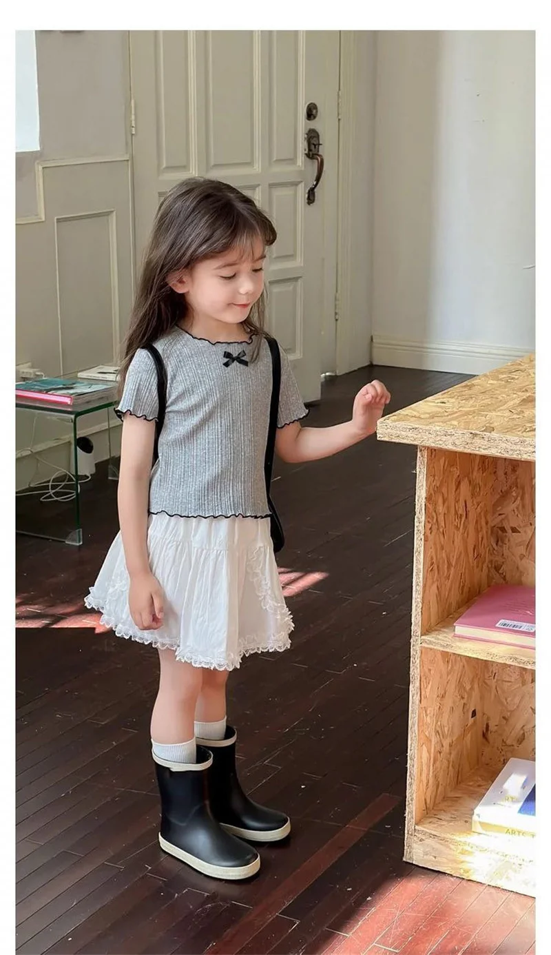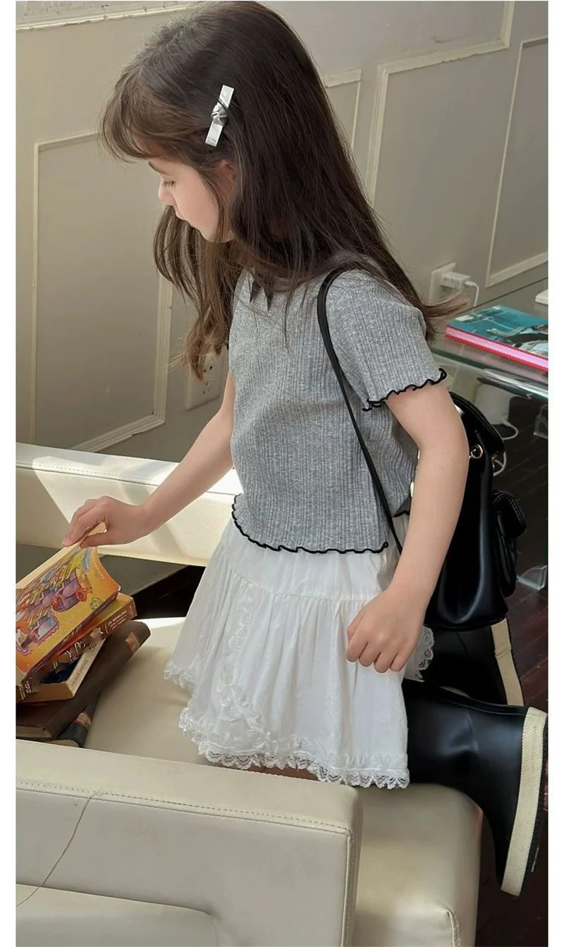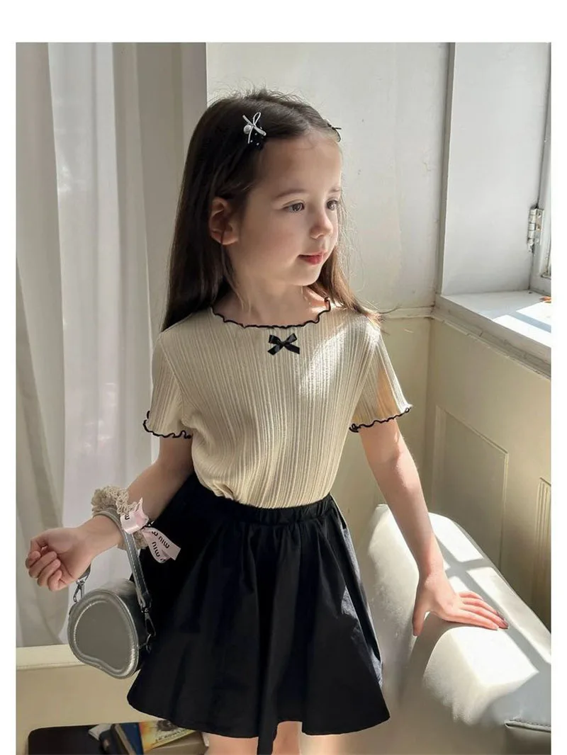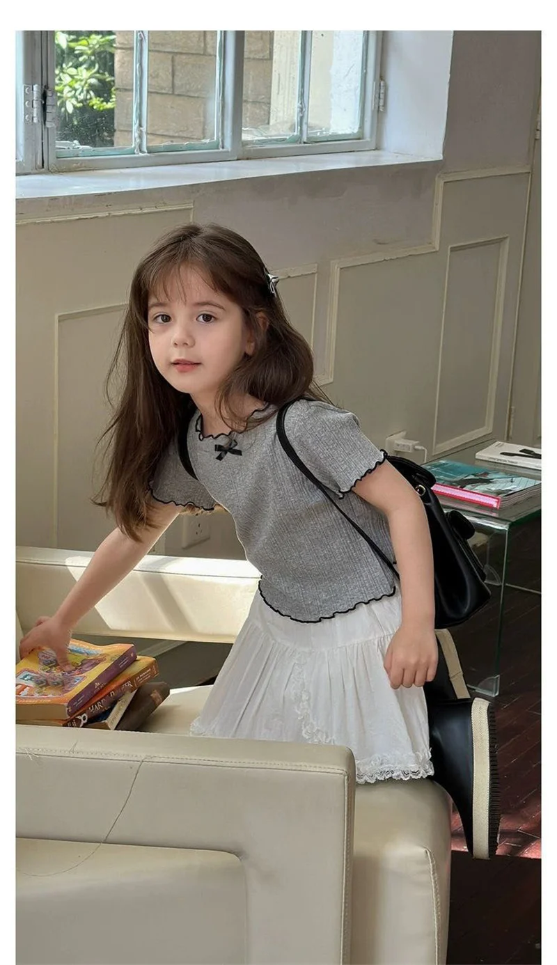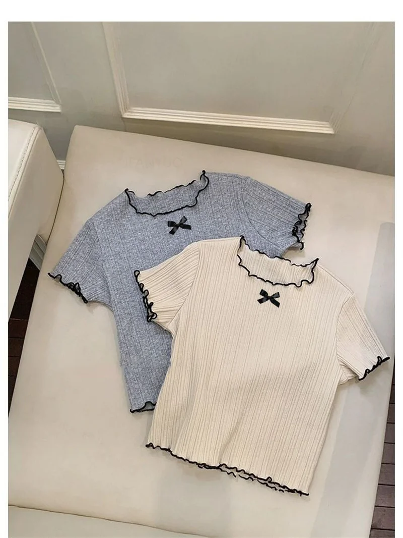 Girl Baby Thin Knit Ruffle Lace Short Sleeve T-shirts 2025 Summer New Girls Kids Bow Tops Sweet Cute Student Children Clothing