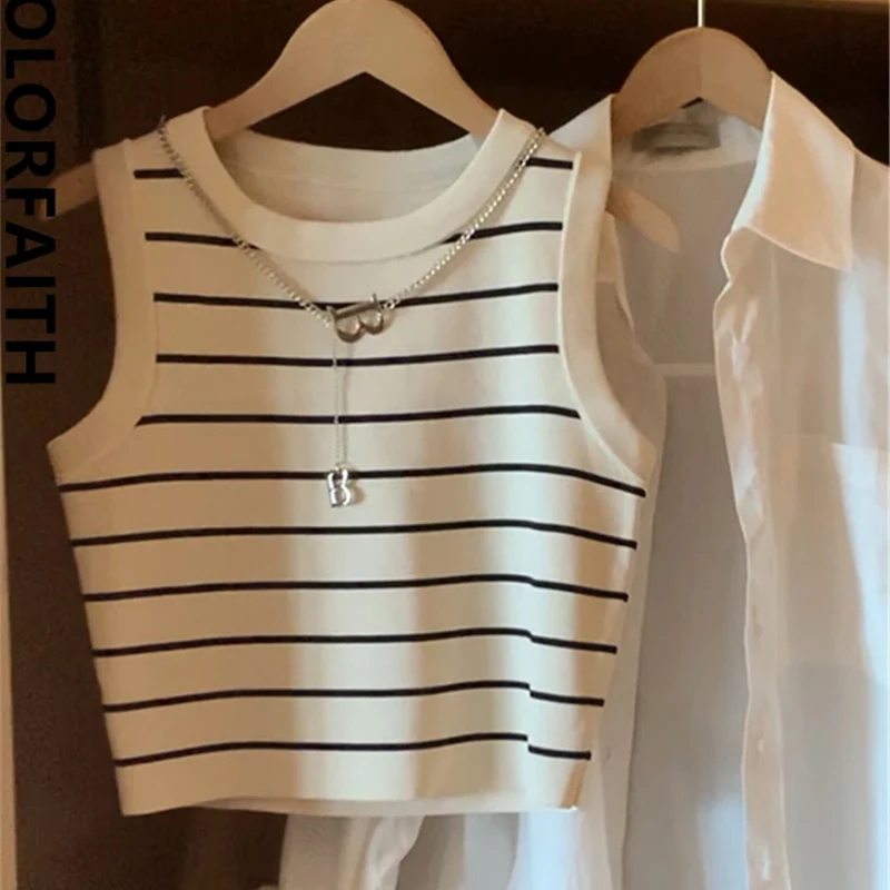 New 2024 Basic Bottoming Striped Chain Elasticity Vests Women Tank & Camis Autumn Winter Wild Crop Short Tops
