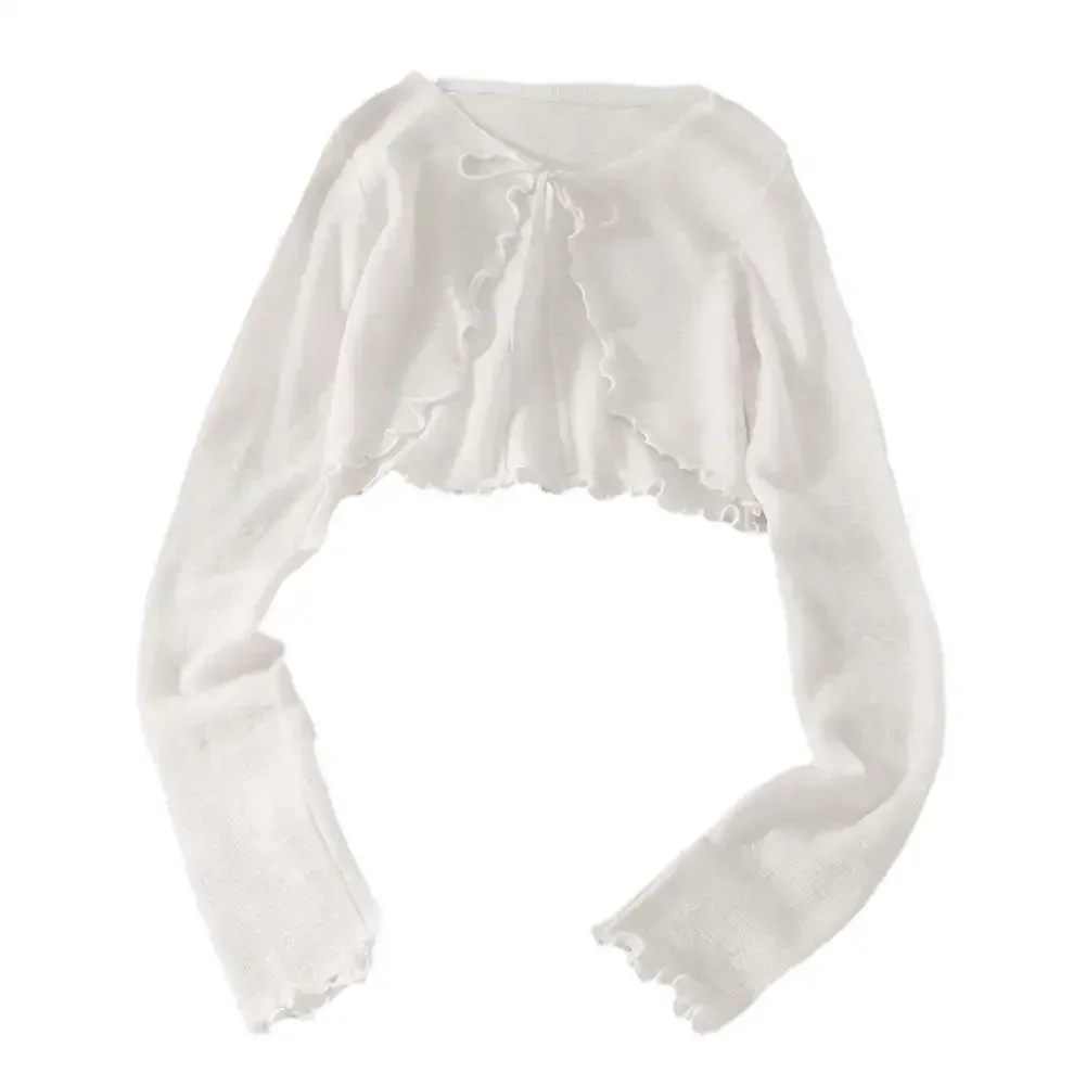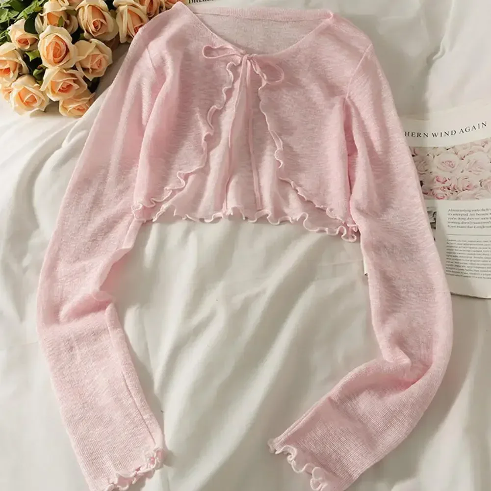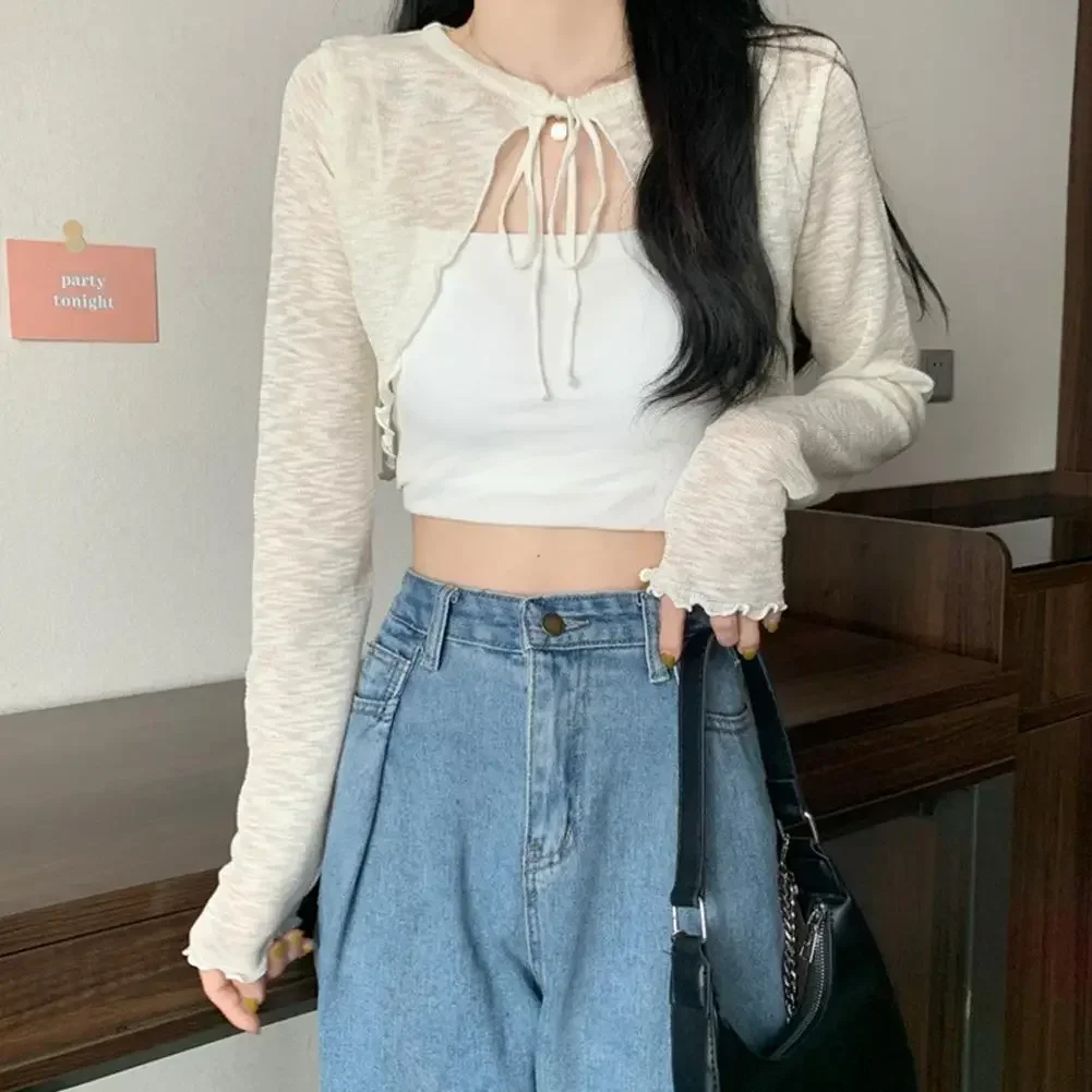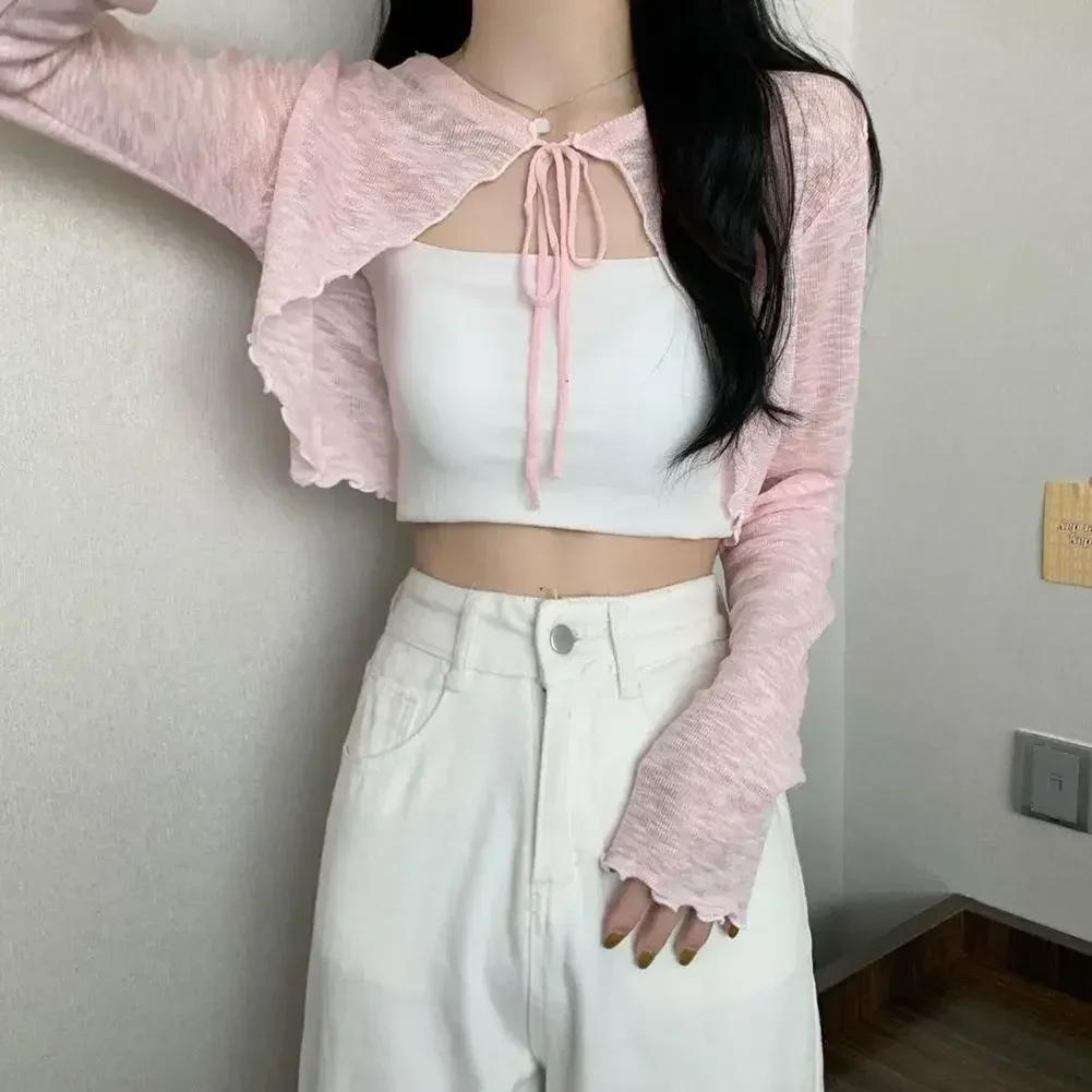 Summer Women Thin Sunscreen Cardigan Lace-up Knitwear Tops Female Korean Style Lantern Sleeve Short Coat Casual Sun Protected